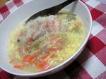 お野菜たっぷりのコンソメスープと冷ご飯と卵で・・・