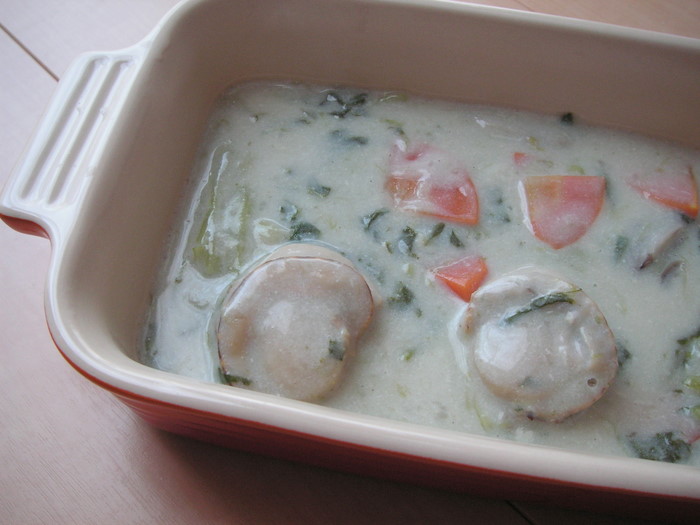 顆粒の鶏ガラスープでだしを取って、牛乳を入れてホワイトシチュー