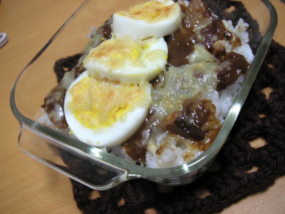 ごはんにハッシュドビーフをかけて、ゆで卵を乗せて、