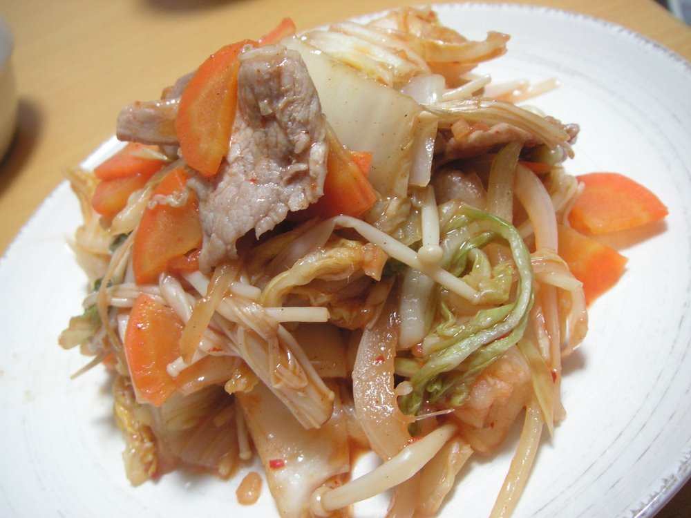 豚肉、にんじん、玉ネギ、エリンギを炒めて、キムチをたっぷり
